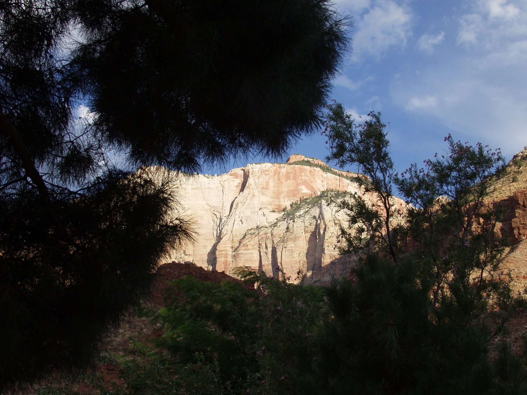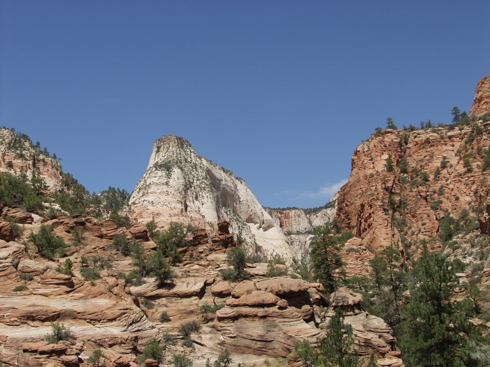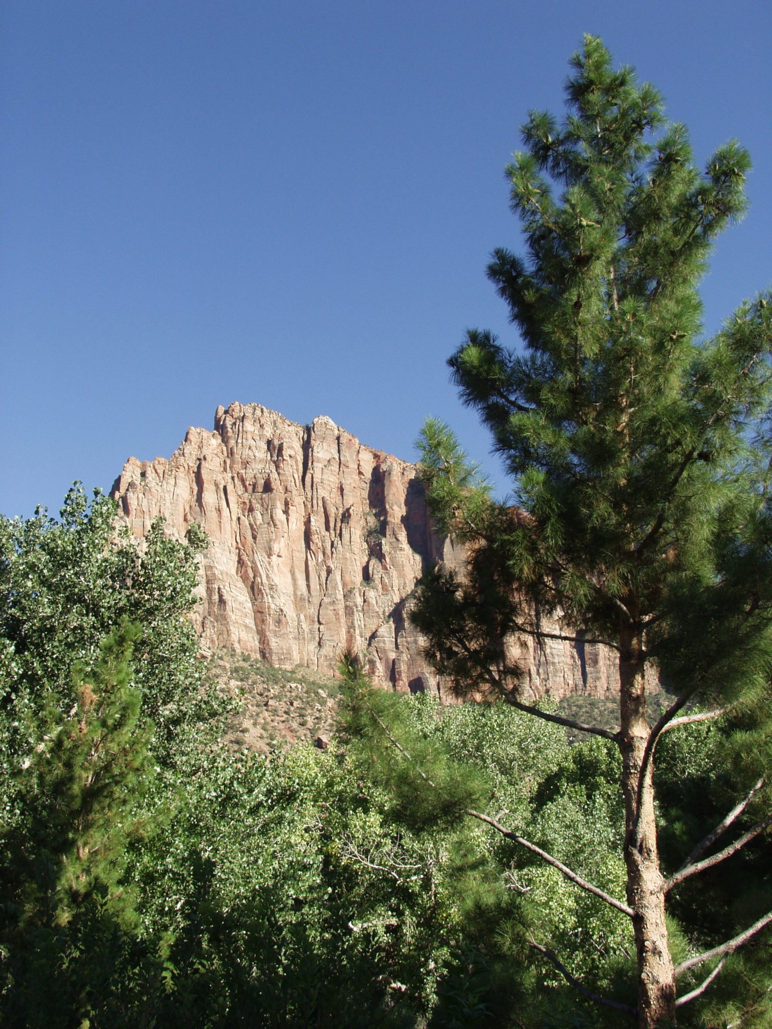 By the time we made it to Zion several days later, we were tired. Our room was spacious and everyone needed down time – except me. I wanted my quiet time in the canyon. Our hotel room was at the edge of the park and I caught a bus that picked up people on the way to the canyon. As everyone dispersed to the hiking trails, I walked to the other side of the road. The steep rock rose into a gem blue sky.