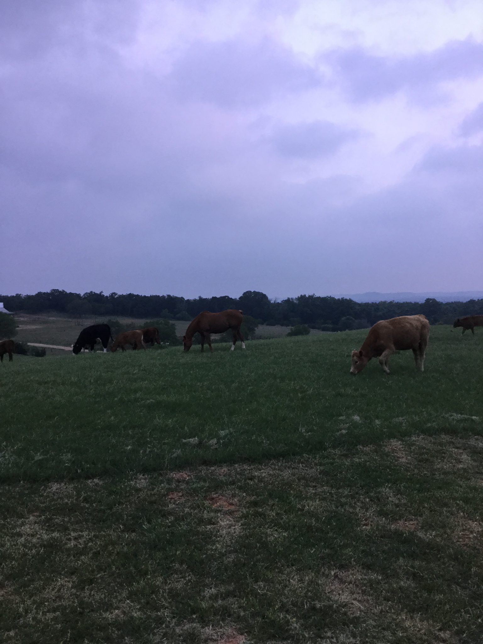 I couldn’t capture Mac as he chased the cows around from inside the fence. The four young cows sniffed up close driving him crazy, but ultimately, the adults moved on and the babies with them. On the other side of the property, they again laid down. The weather is fierce today.