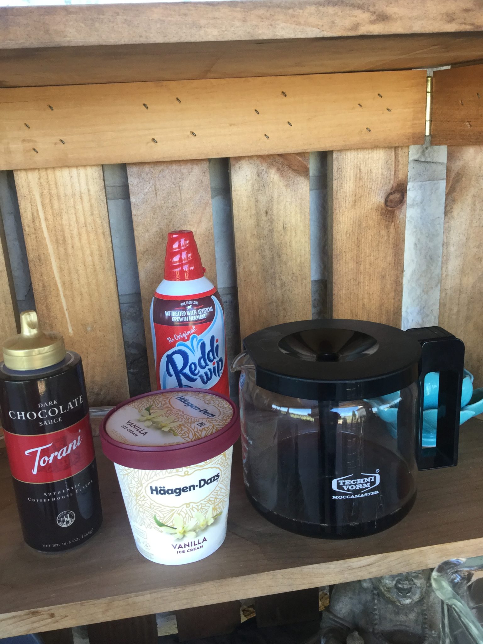 I made myself a coffee shake. I mixed cold strong black coffee. I love the coffee from Independence Coffee Company. Jackhammer. I mixed it with 3 scoops of vanilla ice cream and about 3TB of chocolate syrup. Blend it. Top it with whipped cream and a swirl of chocolate syrup.
